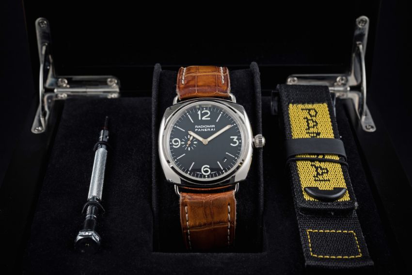 A RARE GENTLEMAN'S 18K SOLID WHITE GOLD PANERAI RADIOMIR 40MM WRIST WATCH CIRCA 2000, REF. PAM 62 C SERIES LIMITED TO 500 PIECES, WITH BOX, ORIGINAL UNDATED PAPERWORK, CHRONOMETER CERTIFICATE & BOOKLETS D: Black dial with white gold batons & quarterly luminous Arabic numerals, subsidiary seconds dial at 9 o'clock, date aperture. M: Automatic chronometer Zenith base movement, signed Officine Panerai & numbered, calibre OP.VII. C: Cushion shaped case with exhibition back, signed Officine Panerai, hallmarked & numbered, case ref. OP 6540, original screw down crown, case width measures approx. 40mm. S: Original Panerai leather strap & 18k solid white gold pin buckle.CONDITION REPORT D: Original dial in excellent condition. M: Working at present. C: In excellent condition with some light surface scratches. S: In fair condition. D: Dial / M: Movement / C: Case / S: Strap / B: Bracelet