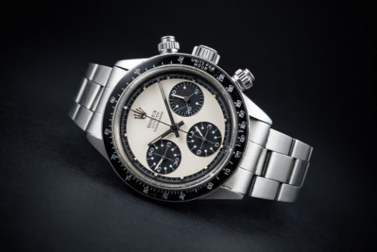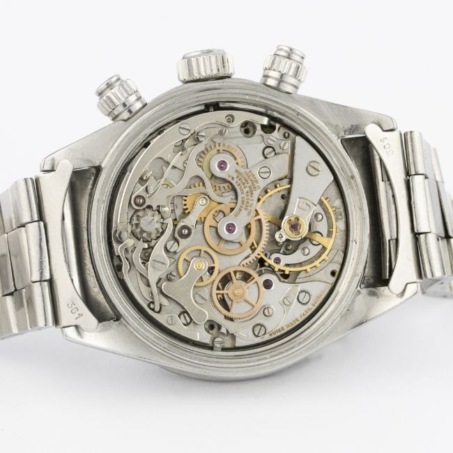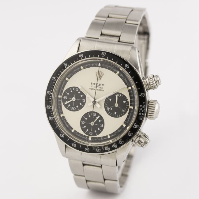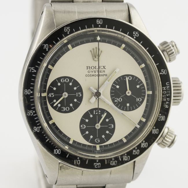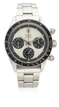 AN EXTREMELY RARE GENTLEMAN'S STAINLESS STEEL ROLEX OYSTER COSMOGRAPH "PAUL NEWMAN" DAYTONA BRACELET WATCH CIRCA 1970, REF. 6263 / 6262 D: "Exotic" dial with part luminous silver markers & hands, triple register recording hours, minutes & continuous seconds. M: 17 jewel manual wind movement, signed Montres Rolex S.A. & numbered, calibre 727. C: Oyster case with units per hour tachymetre bezel, numbered, signed Montres Rolex S.A., numbered, Rolex screw down crown & pushers, case diameter measures approx. 37mm. B: Rolex "light" Oyster bracelet, numbered 7835/361. CONDITION REPORT D: Original dial in excellent condition, with some very small signs of age. M: Working at present. C: In very good condition, with some light scratches due to general use, bezel showing signs of age. B: In very good condition. D: Dial / M: Movement / C: Case / S: Strap / B: Bracelet