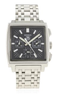 A GENTLEMAN'S STAINLESS STEEL TAG HEUER MONACO CHRONOGRAPH BRACELET WATCH CIRCA 2005, REF. CW2111 WITH TAG HEUER BOX D: Black dial with part luminous silver batons & hands, triple register recording hours, minute & continuous seconds, date aperture. M: Automatic movement signed TAG Heuer. C: Classic Monaco case, signed TAG Heuer Monaco & numbered, original crown & pushers, case width measures approx. 38mm. S: Original TAG Heuer stainless steel bracelet.CONDITION REPORT D: Original dial in excellent condition. M: Working at present. C: In very good condition. B: In excellent condition, with some light scratches due to general use. D: Dial / M: Movement / C: Case / S: Strap / B: Bracelet