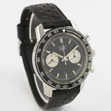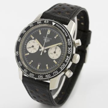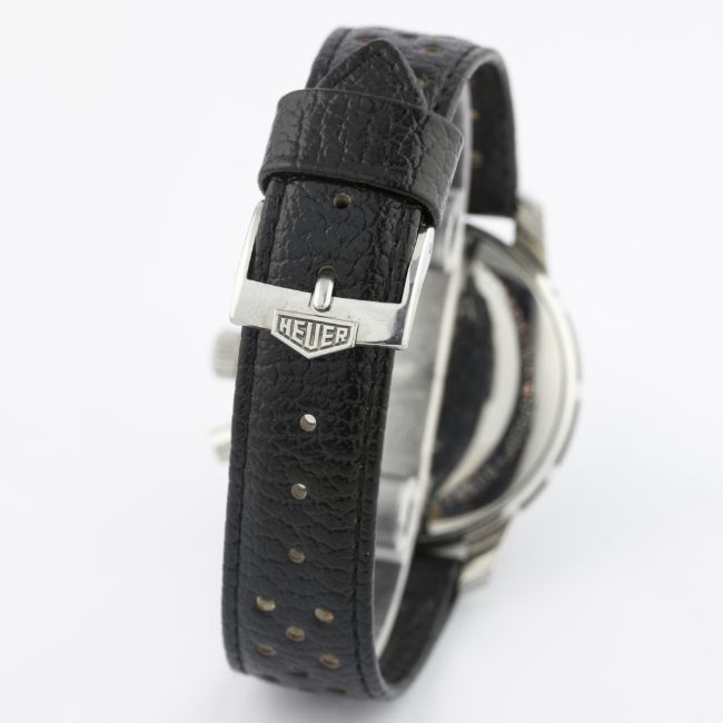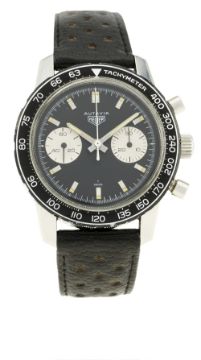 A RARE GENTLEMAN'S STAINLESS STEEL HEUER AUTAVIA CHRONOGRAPH WRIST WATCH CIRCA 1970, REF. 7763C  D: Black dial with part luminous silver batons & hands, two silver registers recording minutes & continuous seconds. M: Manual wind movement signed Heuer-Leonidas SA, Valjoux calibre 7730. C: Circular "compressor" case with rotating tachymetre bezel, signed Heuer Autavia, numbered, Heuer crown & pushers, case diameter measures approx. 41mm. S: Original black leather perforated strap & Heuer pin buckle.CONDITION REPORT D: Original dial in excellent condition, luminous showing a nice patina. M: Working at present. C: In excellent condition. S: In excellent condition. Overall the watch is in almost "NOS" condition. D: Dial / M: Movement / C: Case / S: Strap / B: Bracelet