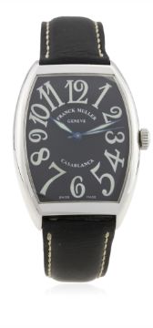 A GENTLEMAN'S STAINLESS STEEL FRANCK MULLER CASABLANCA WRIST WATCH CIRCA 2007, REF. 6850 D: Black dial with large luminous Arabic numerals & blue steel hands. M: Automatic movement signed Franck Muller. C: Tonneau shaped case, signed & numbered, original crown, case measures approx. 47mm by 34mm. S: Original Franck Muller leather strap & pin buckle.CONDITION REPORT D: Original dial in excellent condition. M: Working at present. C: In excellent condition. S: In good condition. D: Dial / M: Movement / C: Case / S: Strap / B: Bracelet