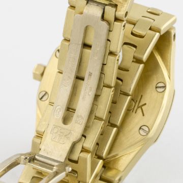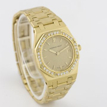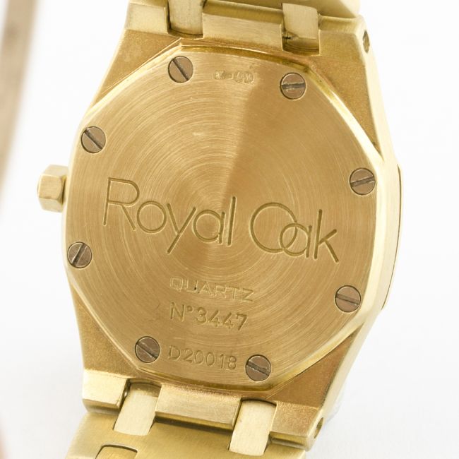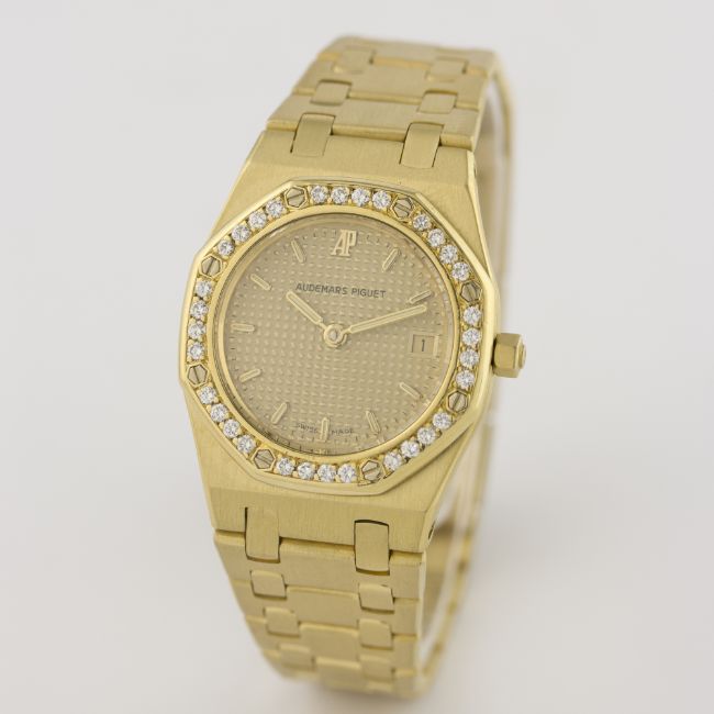 A FINE LADIES 18K SOLID GOLD & DIAMOND AUDEMARS PIGUET ROYAL OAK BRACELET WATCH CIRCA 1990s D: Champagne "Clous de Paris" dial with luminous inlaid gold batons & hands, date aperture. M: Quartz movement, signed Audemars Piguet. C: Classic Royal Oak case with diamond set bezel, signed Royal Oak Quartz, hallmarked & numbered, original crown, case width measures approx. 24mm. B: Original AP 18k solid gold bracelet with flip lock clasp.CONDITION REPORT D: Original dial in excellent condition. M: Working at present. C: In excellent condition. B: In excellent condition. D: Dial / M: Movement / C: Case / S: Strap / B: Bracelet