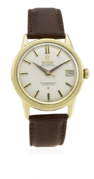 A GENTLEMAN'S 18K SOLID GOLD OMEGA CONSTELLATION CALENDAR CHRONOMETER WRIST WATCH CIRCA 1960 D: Silver dial with black inlaid gilt batons & dauphine hands, date aperture. M: 24 jewel automatic movement signed Omega Watch Co. & numbered, calibre 561. C: Circular 'waterproof' snap back case, signed Omega Watch Co & Dennison Made in England, hallmarked & numbered, Constellation badge embossed onto case back and signed Constellation Waterproof, Omega crown, case diameter measures approx. 35mm. S: Brown leather strap.CONDITION REPORT D: Original dial in excellent condition, showing some very small signs of age. M: Working at present. C: In excellent condition with some light scratches due to general use. S: New. D: Dial / M: Movement / C: Case / S: Strap / B: Bracelet