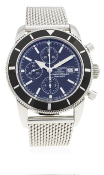 A GENTLEMAN'S STAINLESS STEEL BREITLING SUPEROCEAN HERITAGE CHRONOGRAPH BRACELET WATCH CIRCA 2010, REF. A13320 D: Black dial with silver batons, luminous markers & hands, triple register recording hours, minutes & continuous seconds, date aperture. M: Automatic chronometer movement signed Breitling & numbered. C: Circular case with rotating bezel, signed Breitling & numbered, original crown & pushers, case diameter measures approx. 46mm. B: Original Breitling stainless steel mesh bracelet. CONDITION REPORT D: Original dial in mint condition. M: Working at present. C: In excellent condition, small scratch on the bezel at 9 o'clock. B: In excellent condition. D: Dial / M: Movement / C: Case / S: Strap / B: Bracelet