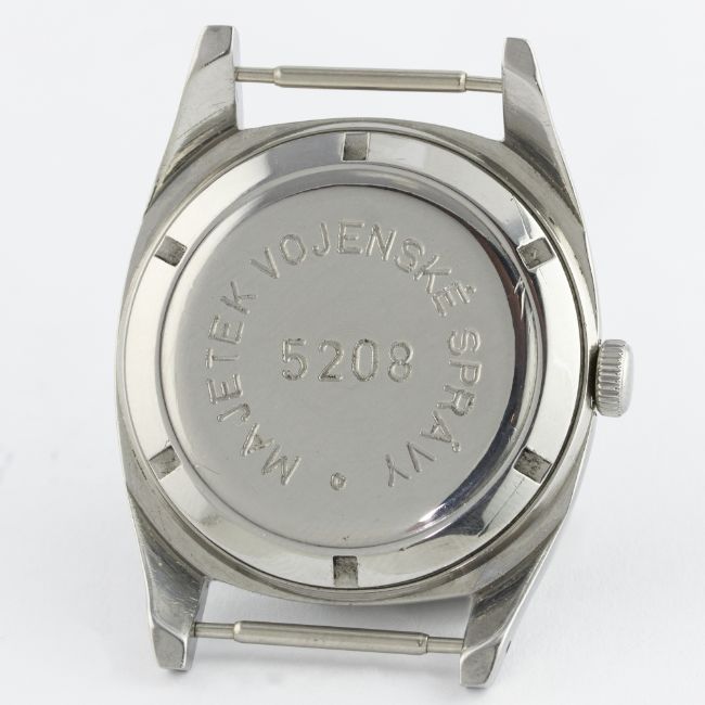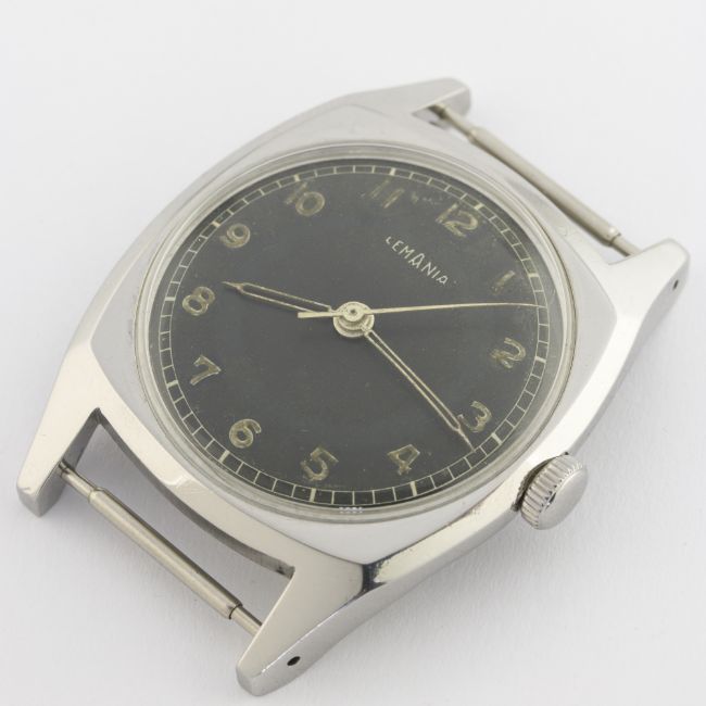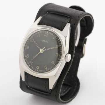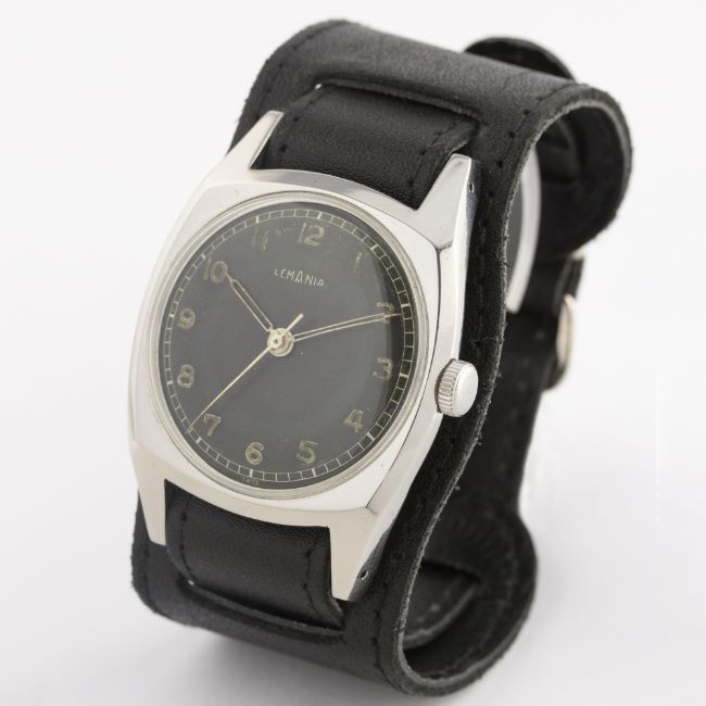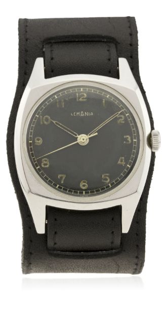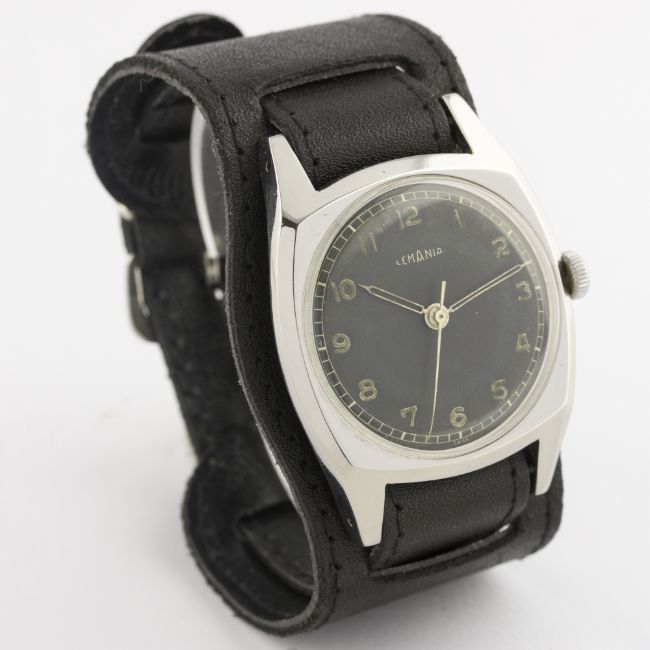 A GENTLEMAN'S STAINLESS STEEL LEMANIA CZECH MILITARY PILOTS WRIST WATCH CIRCA 1940s D: Black dial with luminous Arabic numerals, outer chapter ring. M: 17 jewel manual wind movement signed Lemania Watch Co. & numbered. C: Large cushion shaped case, numbered, issue markings MAJETEK VOJENSKE SPRAVY 5208, case width measures approx. 38mm. S: Black leather BUND style strap.CONDITION REPORT D: Original dial in very good condition, showing some signs of age. M: Working at present. C: In excellent condition, with some light scratches due to general use. S: In excellent condition. D: Dial / M: Movement / C: Case / S: Strap / B: Bracelet