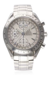 A GENTLEMAN'S STAINLESS STEEL OMEGA SPEEDMASTER AUTOMATIC TRIPLE CALENDAR CHRONOGRAPH BRACELET WATCH CIRCA 2007, REF. 32205000 D: Silver dial with silver batons & hands, triple register recording hours, minutes with day & date apertures and continuous seconds with 24 hour indicator, outer date calendar. M: Automatic chronometer movement, signed Omega & numbered. C: Circular case with tachymetre bezel, signed Omega Watch Co., Speedmaster emblem embossed, numbered, Omega crown & pushers, case diameter measures approx. 40mm. B: Original Omega Speedmaster bracelet, numbered 62/1564/975.CONDITION REPORT D: Original dial in mint condition. M: Working at present. C: In excellent condition, with some light scratches due to general use. B: In excellent condition. D: Dial / M: Movement / C: Case / S: Strap / B: Bracelet