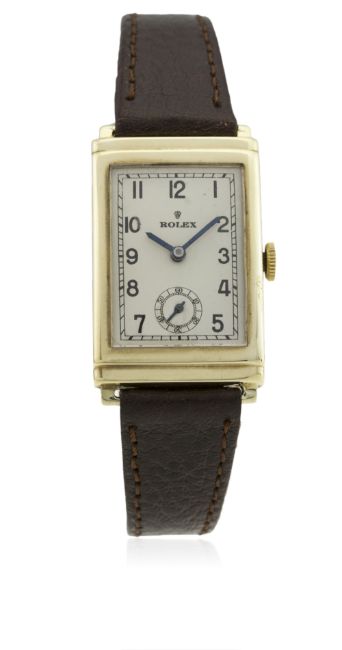 A GENTLEMAN'S 9CT SOLID GOLD ROLEX RECTANGULAR WRIST WATCH CIRCA 1930s D: Silver dial with Arabic numerals, subsidiary seconds. M: 15 jewel manual wind movement signed Rolex. C: Rectangular "stepped" case, signed Rolex 25 World's Records, hallmarked & numbered, Rolex crown, case measures approx. 34mm by 20mm. S: Brown leather strap.CONDITION REPORT D: Dial in excellent condition. M: Working at present. C: In excellent condition. S: In excellent condition. D: Dial / M: Movement / C: Case / S: Strap / B: Bracelet