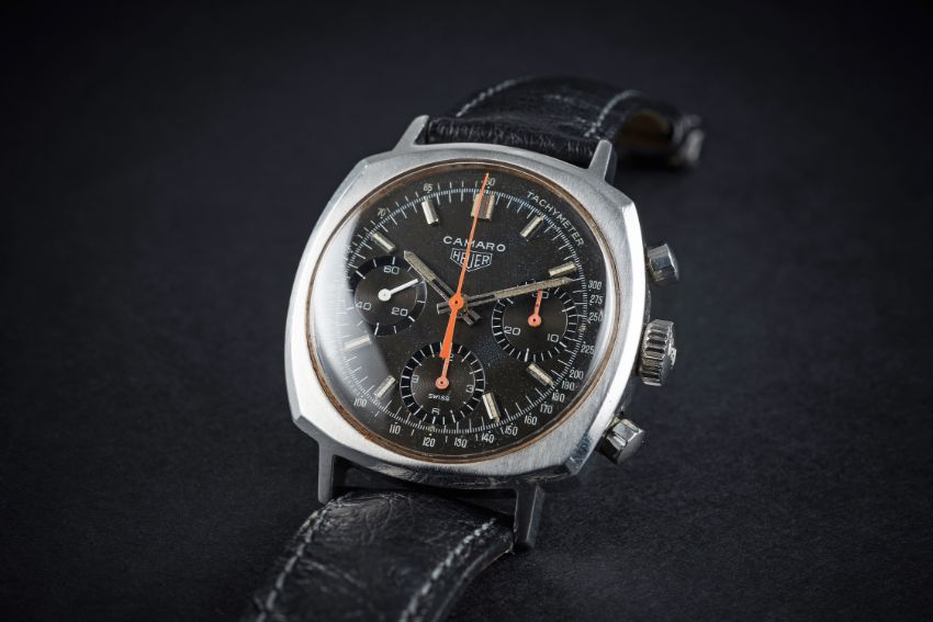 A RARE GENTLEMAN'S STAINLESS STEEL HEUER CAMARO CHRONOGRAPH WRIST WATCH CIRCA 1960s, REF. 73643 WITH "CHOCOLATE" DIAL D: Black dial with luminous inlaid silver batons, triple register recording hours, minutes & continuous seconds, outer tachymetre scale, orange chronograph hands. M: 17 jewel manual wind movement signed Heuer-Leonidas SA, Valjoux calibre 7736. C: Cushion shaped case, signed Heuer-Leonidas S.A., numbered, original Heuer crown, case width measures approx. 37mm. S: Black leather strap.CONDITION REPORT D: Original dial in excellent "chocolate" or "tropical" condition. M: Working at present. C: In very good condition, with some light scratches due to general use. S: In very good condition. D: Dial / M: Movement / C: Case / S: Strap / B: Bracelet