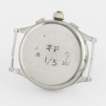 A RARE GENTLEMAN'S BRITISH MILITARY ORATOR CHRONOGRAPH WRIST WATCH CIRCA 1940s  D: Silver dial with gilt Arabic numerals & hands, double register recording minutes & continuous seconds, outer telemetre & tachymeter scales. M: Manual wind movement. C: Circular nickel plated case with stainless steel back, military issue markings TP 1/5. ^F 161, case diameter measures approx. 34mm. S: Leather NATO strap.CONDITION REPORT D: Original dial in excellent condition, showing some small signs of age. M: Working at present. C: In very good condition, with some light scratches & wear. S: In good condition. D: Dial / M: Movement / C: Case / S: Strap / B: Bracelet