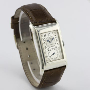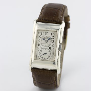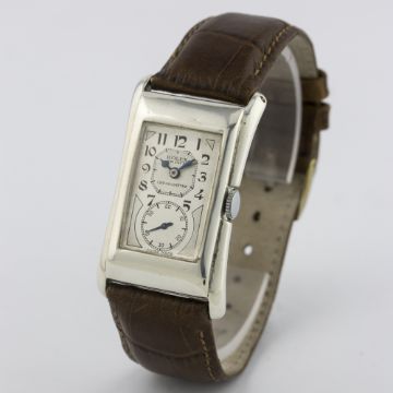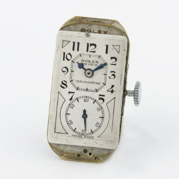 A RARE GENTLEMAN'S SOLID SILVER ROLEX PRINCE BRANCARD WRIST WATCH CIRCA 1930s, REF. 971 U  D: Two tone silver duo dial with black Arabic numerals, subsidiary seconds, blue steel hands. M: 15 jewel manual wind movement, signed Rolex Hairspring Timed 6 Positions. C: Flared rectangular case, signed Rolex 25 World's Records, hallmarked & numbered, case measures approx. 44mm by 26mm. S: Brown leather strap.CONDITION REPORT D: Dial in very good condition, showing some small signs of age. M: Working at present. C: In excellent condition, with some light scratches due to general use. S: In excellent condition. D: Dial / M: Movement / C: Case / S: Strap / B: Bracelet