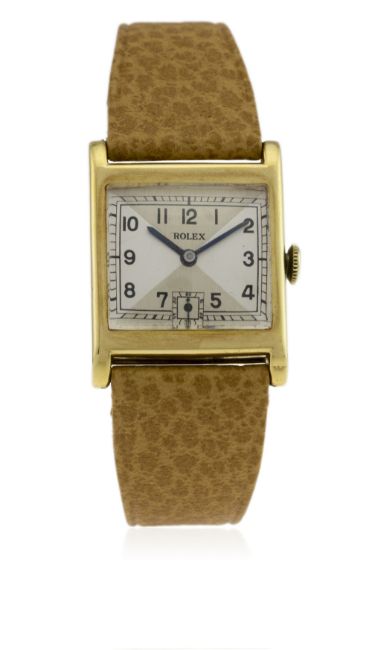 A GENTLEMAN'S 18K SOLID GOLD ROLEX WRIST WATCH CIRCA 1940s D: Quartered two tone silver dial with black Arabic numerals, subsidiary seconds, outer tracking. M: 15 jewel manual wind movement, signed Rolex Timed 6 Positions For All Climates. C: Square case, signed Rolex 7 World's Records, hallmarked & numbered, case width measures approx. 26mm. S: Leather strap.CONDITION REPORT D: Dial in excellent condition. M: Working at present. C: In very good condition, with some light scratches due to general use. S: New. D: Dial / M: Movement / C: Case / S: Strap / B: Bracelet