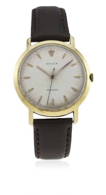 A RARE GENTLEMAN'S LARGE SIZE 18K SOLID GOLD ROLEX PRECISION WRIST WATCH CIRCA 1950s, REF. 510  D: Silver "honeycomb" dial with gilt "pencil" batons & hands. M: 17 jewel manual wind movement, signed Montres Rolex S.A. & numbered, calibre 1210. C: Circular case, signed DS&S, hallmarked & numbered, case diameter measures approx. 37mm. S: Brown leather strap.CONDITION REPORT D: Original dial in excellent condition, showing a patina & some small signs of age. M: Working at present. C: In very good condition, with some light scratches due to general use. S: In excellent condition. D: Dial / M: Movement / C: Case / S: Strap / B: Bracelet