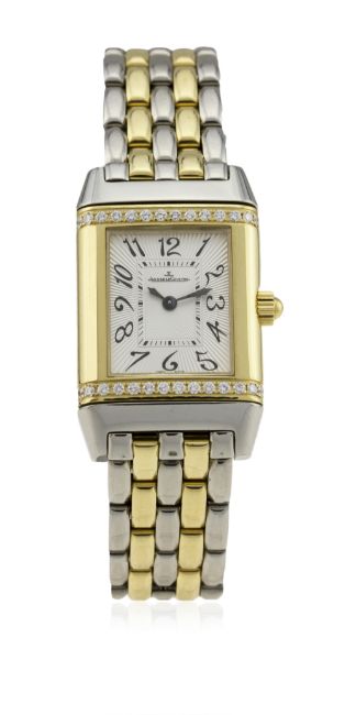 A LADIES STAINLESS STEEL & 18K SOLID GOLD & DIAMOND JAEGER LECOULTRE REVERSO BRACELET WATCH CIRCA 2000s, REF. 265.5.08 D: Silver sunburst dial with Arabic numerals & inner minute track. M: Quartz movement signed Jaeger LeCoultre. C: Classic Reverso case with original set diamonds, signed Jaeger LeCoultre Reverso & numbered, case measures approx. 33mm by 21mm. B: Original JLC stainless steel & 18k solid gold bracelet.CONDITION REPORT D: Original dial in mint condition. M: Working at present. C: In excellent condition. B: In excellent condition. D: Dial / M: Movement / C: Case / S: Strap / B: Bracelet