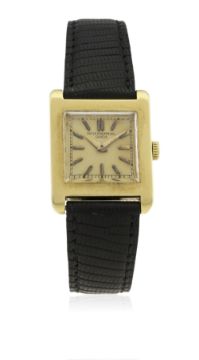 A GENTLEMAN'S 18K SOLID GOLD PATEK PHILIPPE WRIST WATCH CIRCA 1930s D: Silver dial Calatrava type dial with gilt batons & dauphine hands. M: 18 jewel manual wind movement signed Patek Philippe & Co., numbered. C: Square shaped case, signed Patek Philippe & Co., hallmarked & numbered, case width measures approx. 25mm. S: Black leather strap with original Patek Philippe 18k solid gold pin buckle. CONDITION REPORT D: Original dial in very good condition, showing a strong patina & small signs of age. M: Working at present. C: In excellent condition, with some light scratches due to general use. S: In good condition.   D: Dial / M: Movement / C: Case / S: Strap / B: Bracelet