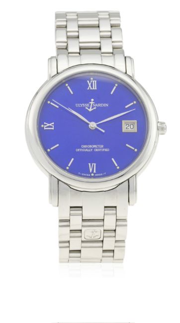 A GENTLEMAN'S STAINLESS STEEL ULYSEE NARDIN SAN MARCO AUTOMATIC CHRONOMETER BRACELET WATCH CIRCA 1990s, REF. 133-77-9 WITH ULYSSE NARDIN BOX D: Blue enamel guilloche dial with silver batons & quarterly Roman numerals, date aperture. M: Automatic chronometer movement, signed Ulysee Nardin & numbered. C: Circular case, signed Ulysee Nardin & numbered, case back embossed with the Lion of San Marco, original crown, case diameter measures approx. 37mm. B: Original stainless steel Ulysee Nardin bracelet.CONDITION REPORT D: Original dial in excellent condition. M: Working at present. C: In excellent condition, with some light scratches due to general use. B: In excellent condition. D: Dial / M: Movement / C: Case / S: Strap / B: Bracelet
