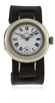A RARE GENTLEMAN'S LARGE SIZE OMEGA "OFFICERS" WRIST WATCH CIRCA 1916 D: White enamel dial with black Roman numerals, subsidiary seconds, decorative hands, outer chapter ring. M: Manual wind movement signed Omega & numbered. C: Circular hinged nickel case, signed Omega & numbered, "onion" crown, case diameter measures approx. 41mm. S: Leather strap.CONDITION REPORT D: Original dial in excellent condition. M: Working at present. C: In excellent condition, with some light scratches due to general use. S: In excellent condition. D: Dial / M: Movement / C: Case / S: Strap / B: Bracelet