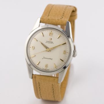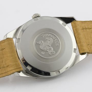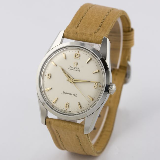 A GENTLEMAN'S STAINLESS STEEL OMEGA SEAMASTER AUTOMATIC WRIST WATCH CIRCA 1961, REF. 14700 2 SC D: Silver dial with gilt "coffin" markers & quarterly Arabic numerals, dauphine hands. M: 24 jewel automatic movement, signed Omega Watch Co. & numbered, calibre 551. C: Circular screw back case, signed Omega Watch Co., Seamaster emblem embossed on case back, Omega crown, case diameter measures approx. 34mm. S: Brown leather strap.CONDITION REPORT D: Original dial in excellent condition. M: Working at present. C: In excellent condition. S: In excellent condition. D: Dial / M: Movement / C: Case / S: Strap / B: Bracelet