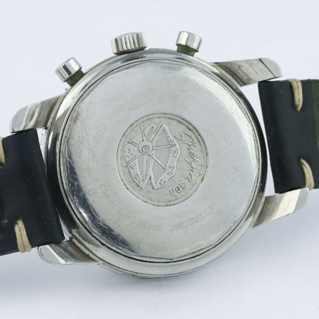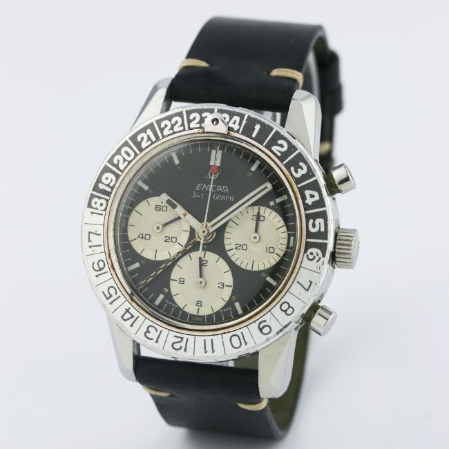 A RARE GENTLEMAN'S STAINLESS STEEL ENICAR JET GRAPH GMT CHRONOGRAPH WRIST WATCH CIRCA 1969, REF. 072-02-02 A D: Black dial with part luminous markers & hands, three silver registers recording hours, minutes & continuous seconds, chequered GMT hand. M: 17 jewel manual wind movement signed Enicar, Valjoux calibre 724. C: Large circular screw back EPSA compressor case with rotating 24 hour bezel, signed Enicar Watch Co. & numbered, Sherpa 300 emblem embossed on case back & numbered, Enicar crown, case diameter measures approx. 40mm. S: Black Horween leather strap.CONDITION REPORT D: Original dial in excellent condition, showing some signs of age. M: Working at present. C: In excellent condition, with some light scratches due to general use, bezel nicely faded. S: In excellent condition. D: Dial / M: Movement / C: Case / S: Strap / B: Bracelet