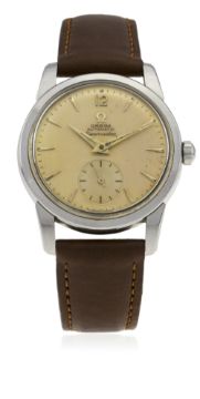 A GENTLEMAN'S STAINLESS STEEL OMEGA SEAMASTER AUTOMATIC WRIST WATCH CIRCA 1956, REF. 2846-8 SC WITH "SALMON PINK" PATINA D: Silver dial with gilt "dagger" batons & dauphine hands, subsidiary seconds. M: 19 jewel automatic movement, signed Omega Watch Co. & numbered, calibre 491. C: Circular snap back 'Seamaster Waterproof' case, signed Omega Watch Co., Omega crown, case diameter measures approx. 34mm. S: Brown leather strap.CONDITION REPORT D: Original dial in excellent condition, showing a nice even "salmon pink" patina. M: Working at present. C: In excellent condition, with some light scratches due to general use. S: New. D: Dial / M: Movement / C: Case / S: Strap / B: Bracelet