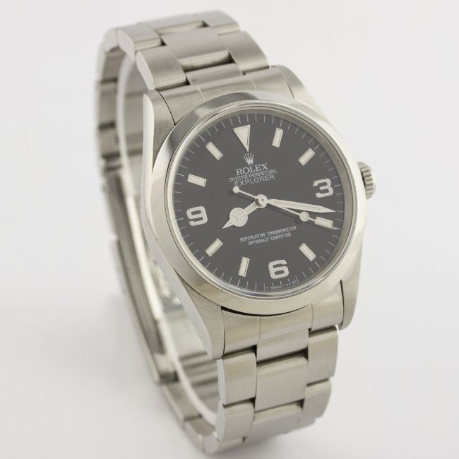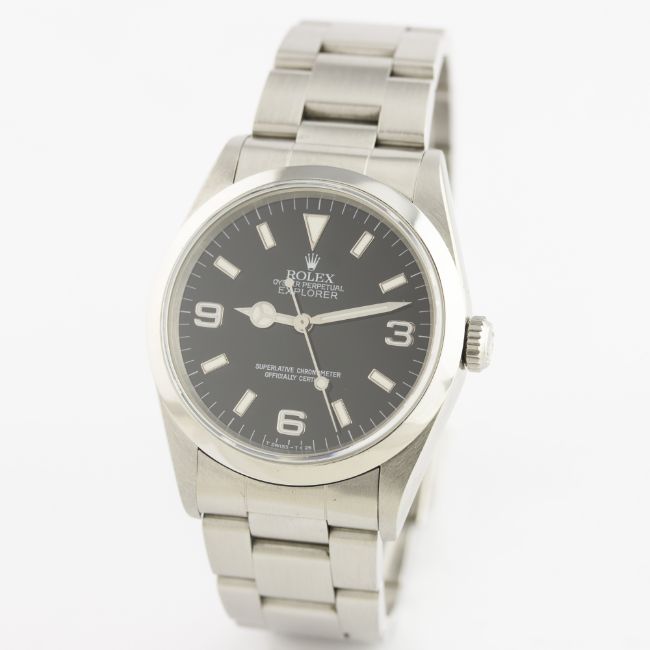 A GENTLEMAN'S STAINLESS STEEL ROLEX OYSTER PERPETUAL EXPLORER BRACELET WATCH CIRCA 1995, REF. 14270 D: Gloss black dial with luminous inlaid white gold markers & 3-6-9 Arabic numerals, Mercedes hands. M: Automatic chronometer movement, signed Rolex & numbered. C: Oyster case, signed Montres Rolex S.A., W serial no., Rolex crown, sapphire crystal, case diameter measures approx. 36mm. B: Rolex Oyster bracelet, numbered V2/78360/558B.CONDITION REPORT D: Original dial in excellent condition. M: Working at present. C: In excellent condition. B: In excellent condition. D: Dial / M: Movement / C: Case / S: Strap / B: Bracelet