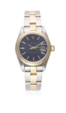 A LADIES STEEL & GOLD ROLEX OYSTER PERPETUAL DATEJUST BRACELET WATCH CIRCA 1995  D: Blue dial with gilt batons & hands, date aperture. M: 29 jewel automatic chronometer movement with quick-set date, signed Rolex & numbered, calibre 2135. C: Oyster case with 18k solid gold fluted bezel, sapphire crystal, signed Montres Rolex S.A., Rolex crown, case diameter measures approx. 26mm. B: Original steel & 18k solid gold Rolex Oyster bracelet, numbered R8/78343-18/490-B.CONDITION REPORT D: Original dial in excellent condition. M: Working at present. C: In excellent condition. S: In excellent condition. D: Dial / M: Movement / C: Case / S: Strap / B: Bracelet
