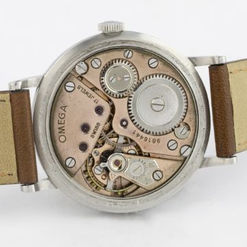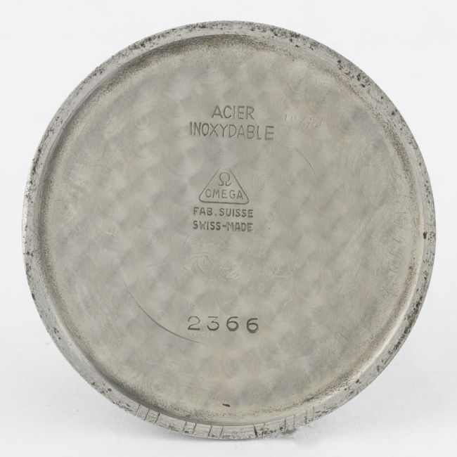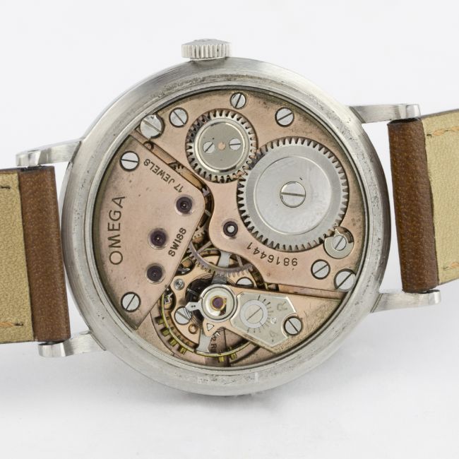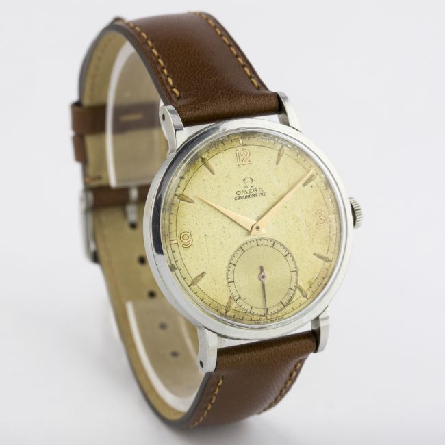 A RARE GENTLEMAN'S LARGE SIZE STAINLESS STEEL OMEGA CHRONOMETRE WRIST WATCH DATED 1944, REF. CK 2366 WITH OMEGA EXTRACT OF THE ARCHIVES D: Two tone silver dial with gilt batons & quarterly Arabic numerals, dauphine hands, subsidiary seconds. M. 17 jewel manual wind movement with RG regulator, signed Omega & numbered, calibre 30T2 RG. C: Circular snap back case, signed Omega, Omega crown, case diameter measures approx. 36mm. S: Brown leather strap.CONDITION REPORT D: Original dial in good condition, showing some signs of age and a strong patina. M: Working at present. C: In excellent condition, with some light scratches due to general use. S: New. D: Dial / M: Movement / C: Case / S: Strap / B: Bracelet
