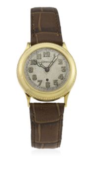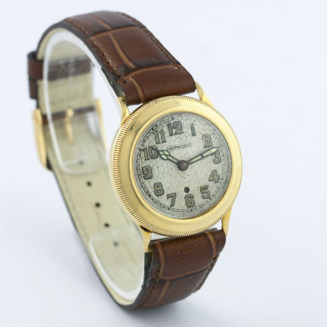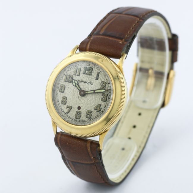 A RARE GENTLEMAN'S 18K SOLID GOLD HARWOOD AUTOMATIC WRIST WATCH CIRCA 1930s D: Silver textured dial with luminous Arabic numerals & cathedral hands, aperture to indicate setting of hands. M: 15 jewel automatic movement with patent number, signed Harwood Self Winding Watch Co Ltd. C: Circular case with rotating bezel to adjust hands, hallmarked & numbered, case diameter measures approx. 29mm. S: Leather strap.CONDITION REPORT D: Original dial in excellent condition, showing some small signs of age. M: Working at present. C: In excellent condition, with some light scratches due to general use. S: In excellent condition. D: Dial / M: Movement / C: Case / S: Strap / B: Bracelet