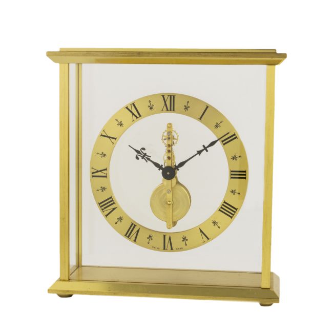 A JAEGER LECOULTRE 8 DAY DESK CLOCK CIRCA 1970, REF. 508 D: Gilt chapter ring with Roman numerals, fleur-de-lis hands. M: Manual wind 8 day inline movement. C: Gilt metal case with transparent panels, measures approx 16.2cm by 15cm by 5.9cm. CONDITION REPORT D: Original dial in excellent condition. M: Working at present. C: In very good condition. D: Dial / M: Movement / C: Case / S: Strap / B: Bracelet