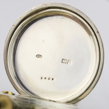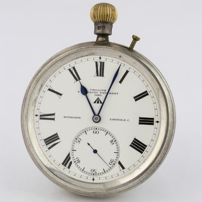 A RARE SOLID SILVER CASED BRITISH ROYAL NAVY FREE SPRUNG DECK WATCH BY PHILIPS, 4 FINSBURY PAVEMENT, MOORGATE LONDON CIRCA 1911, IN ORIGINAL FITTED WOODEN BOX D: White enamel dial with Roman numerals, numbered 1983. M: English keyless wind free sprung movement signed Philips, numbered 1983, engraved military arrow. C: Circular hinged case, marked ATO, London hallmarks, original crown, engraved military arrow, case diameter measures approx. 57mm excluding the neck & crown.CONDITION REPORT D: Original dial in excellent condition. M: Working at present. C: In excellent condition with some light surface scratches. D: Dial / M: Movement / C: Case / S: Strap / B: Bracelet