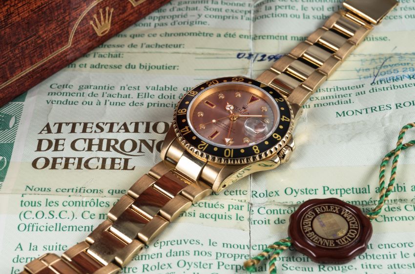 A RARE GENTLEMAN'S 18K SOLID GOLD ROLEX OYSTER PERPETUAL DATE GMT MASTER II "SERTI" DIAL BRACELET WATCH DATED 1995, REF. 16718 WITH BOX & PAPERS D: Grey dial with original diamond & ruby set markers, Mercedes hands, dual time zone arrow hand, date aperture. M: 31 jewel automatic chronometer movement with quick-set date, signed Montres Rolex S.A. & numbered, calibre 3185. C: Oyster case with 24 hour rotating bezel, sapphire crystal, signed Montres Rolex S.A., hallmarked & numbered, X serial no., Rolex crown, case diameter measures approx. 40mm. B: Rolex Oyster 18k solid gold bracelet with flip lock clasp & extension, numbered R9/92908.CONDITION REPORT D: Original dial in excellent condition. M: Working at present. C: In excellent condition. B: In excellent condition. D: Dial / M: Movement / C: Case / S: Strap / B: Bracelet