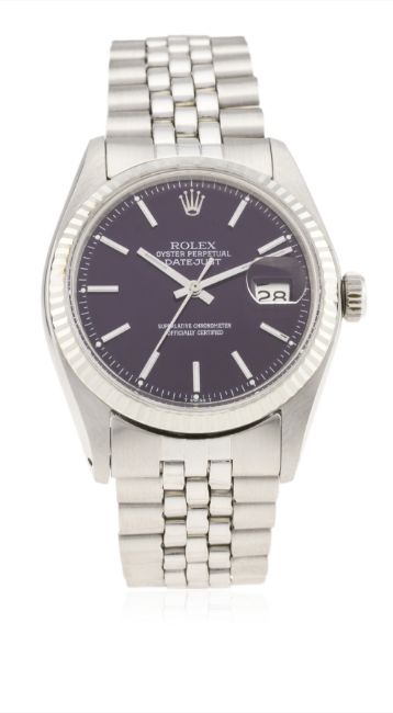 A GENTLEMAN'S STEEL & WHITE GOLD ROLEX OYSTER PERPETUAL DATEJUST BRACELET WATCH CIRCA 1972, REF. 1601  D: Purple sunburst dial with white inlaid silver batons, date aperture. M: 26 jewel automatic chronometer movement, signed Montres Rolex S.A., calibre 1570. C: Oyster case with solid white gold fluted bezel, signed Montres Rolex S.A., dated II.72, numbered, Rolex crown, case diameter measures approx. 36mm B: Rolex Jubilee bracelet, numbered 62510H/55, dated 1.76. CONDITION REPORT D: Dial in excellent condition. M: Working at present. C: In excellent condition. B: In excellent condition. D: Dial / M: Movement / C: Case / S: Strap / B: Bracelet