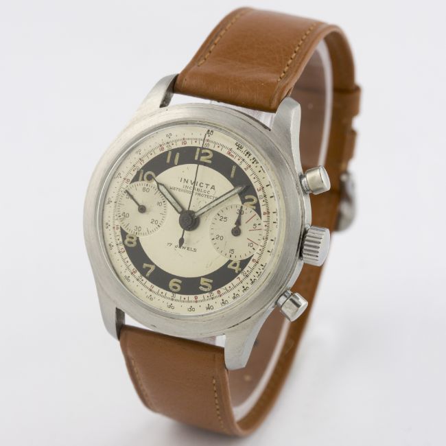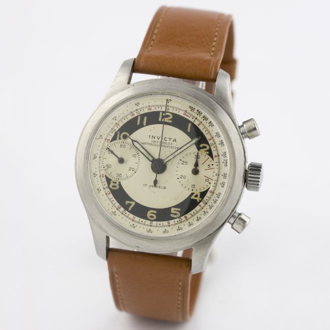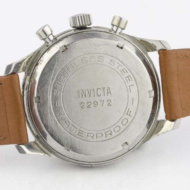 A GENTLEMAN'S STAINLESS STEEL INVICTA CHRONOGRAPH WRIST WATCH CIRCA 1950 D: Two tone dial with luminous Arabic numerals & "syringe" hands, double register recording minutes & continuous seconds, outer tachymeter & telemeter scales. M: 17 jewel manual wind incabloc movement signed Invicta Ltd, Landeron calibre 48. C: Circular screw back case, signed Invicta & numbered, case diameter measures approx. 36mm. S: Brown leather strap.CONDITION REPORT D: Original dial in very good condition, showing some smalls signs of age. M: Working at present. C: In excellent condition, with some light scratches due to general use. S: In excellent condition. D: Dial / M: Movement / C: Case / S: Strap / B: Bracelet