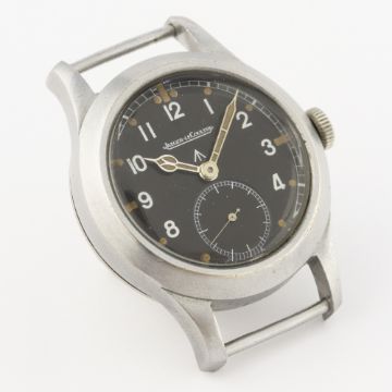 A RARE GENTLEMAN'S BRITISH MILITARY JAEGER LECOULTRE W.W.W. WRIST WATCH CIRCA 1940s D: Black dial with Arabic numerals, luminous markers & "cathedral" hands, military arrow, subsidiary seconds. M: Manual wind movement, signed Jaeger-LeCoultre & numbered, calibre 479. C: Military nickel plated case with steel back, fixed bars, signed LeCoultre Co., issue markings 286826 ^ W.W.W. F16128, case diameter measures approx. 35mm. S: NATO strap.CONDITION REPORT D: Original dial in excellent condition. M: Working at present. C: In excellent condition, with some small scratches due to use. S: In excellent condition. D: Dial / M: Movement / C: Case / S: Strap / B: Bracelet
