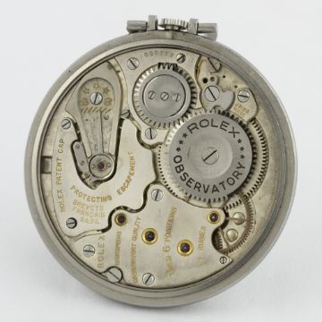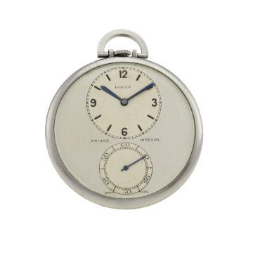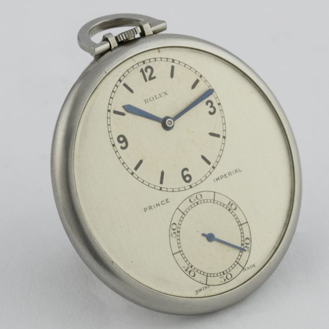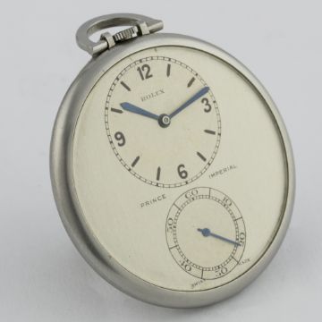 A RARE GENTLEMAN'S STAINLESS STEEL ROLEX PRINCE IMPERIAL POCKET WATCH CIRCA 1920s D: Two tone silver dial with two subsidiary dials displaying time & continuous seconds, blue steel hands. M: 17 jewel keyless wind movement signed Rolex Observatory Quality, Timed 6 Positions & numbered. C: Circular case, signed Rolex Prince Imperial, 25 Records Universels, numbered, case diameter measures approx. 42mm excluding the neck & bow.CONDITION REPORT D: Original dial in excellent condition. M: Working at present. C: In excellent condition, with some light scratches due to general use. D: Dial / M: Movement / C: Case / S: Strap / B: Bracelet
