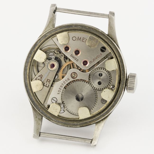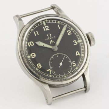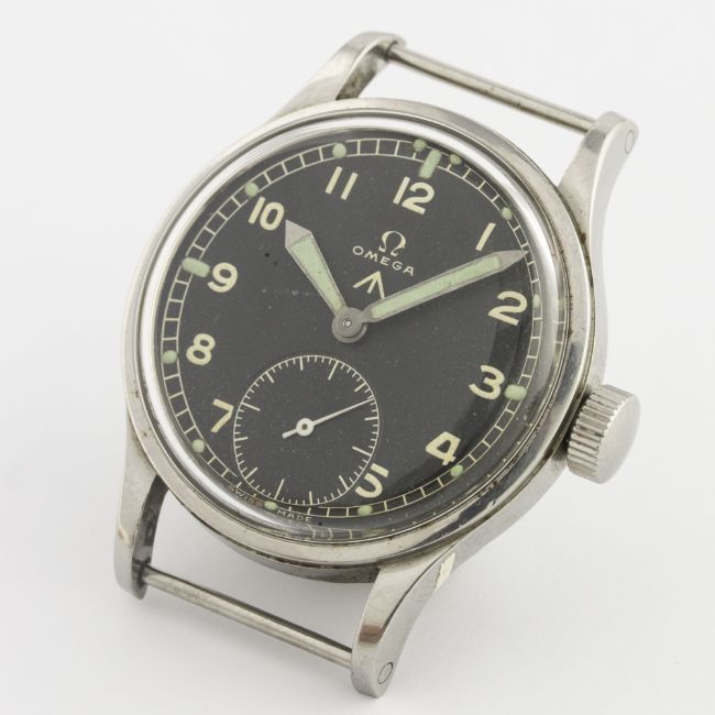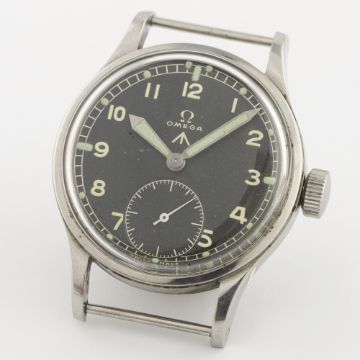A GENTLEMAN'S STAINLESS STEEL BRITISH MILITARY OMEGA W.W.W. WRIST WATCH CIRCA 1940s D: Black dial with Arabic numerals, luminous markers & "sword" hands, military arrow, subsidiary seconds. M: 15 jewel manual wind movement signed Omega & numbered, calibre 30T2. C: Military case with fixed bars, signed Omega Watch Co, issue markings W.W.W.^ Y14378 10678577, case diameter measures approx. 35mm. S: NATO strap.CONDITION REPORT D: Original dial in very good condition, showing some signs of age. M: Working at present. C: In very good condition. S: In excellent condition. D: Dial / M: Movement / C: Case / S: Strap / B: Bracelet