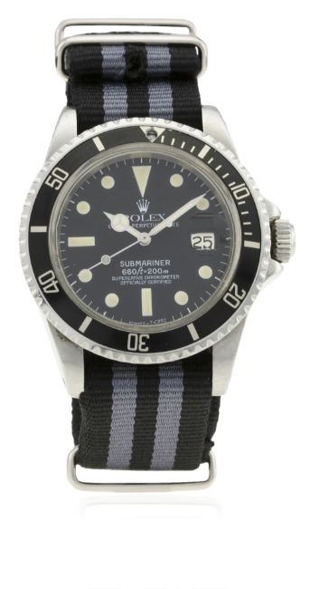 A GENTLEMAN'S STAINLESS STEEL ROLEX OYSTER PERPETUAL DATE SUBMARINER WRIST WATCH CIRCA 1979, REF. 1680 D: Matt black dial with luminous markers & Mercedes hands, date aperture. M: 26 jewel automatic chronometer movement, signed Montres Rolex S.A. & numbered, calibre 1570. C: Oyster case with 60 minute rotating bezel, signed Montres Rolex S.A., numbered, very light inscription on case back, Rolex triplock crown, case diameter measures approx. 40mm. S: NATO strap.CONDITION REPORT D: Original dial in excellent condition. M: Working at present. C: In very good condition with some scratches due to general use. S: New. D: Dial / M: Movement / C: Case / S: Strap / B: Bracelet