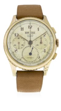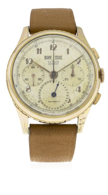 A GENTLEMAN'S LARGE SIZE GOLD PLATED TITUS TRIPLE CALENDAR CHRONOGRAPH WRIST WATCH CIRCA 1950s D: Two tone silver dial with gilt Art Deco numerals, three subsidiary dials recording minutes, continuous seconds and date calendar, day & month apertures, outer tachymeter scale. M: Manual wind movement signed Titus Geneve. C: Circular case with rotating bezel to change day, month & date, signed A.C.M., case diameter measures approx. 38mm. S: Leather strap.CONDITION REPORT D: Original dial in good condition, showing a signs of age. M: Working at present. C: In good condition, with some scratches & light wear. S: In good condition. D: Dial / M: Movement / C: Case / S: Strap / B: Bracelet