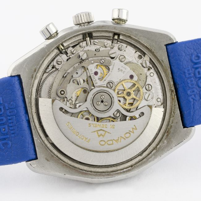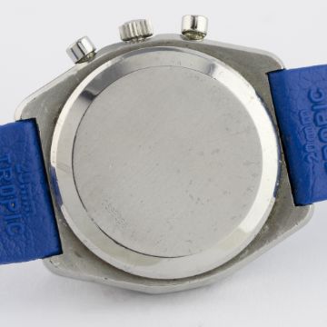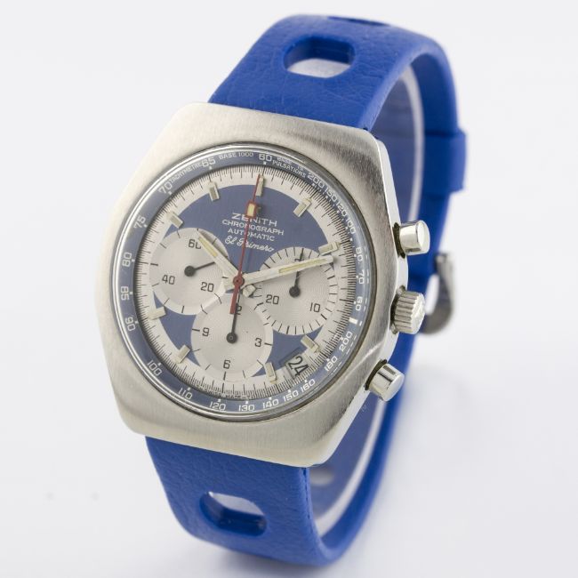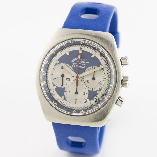 A RARE GENTLEMAN'S STAINLESS STEEL ZENITH EL PRIMERO AUTOMATIC CHRONOGRAPH WRIST WATCH CIRCA 1970s D: Blue & silver dial with faceted silver batons, three overlapping registers recording hours, minutes & continuous seconds, off-set date aperture, blue inner bezel with tachymetre. M: 31 jewel automatic movement, signed Zenith on the movement & Movado Factories on the rotor, calibre 3019 PHC. C: Tonneau shaped case, signed Movado Zenith with emblem, numbered, case width measures approx. 37mm. S: Blue Tropic Sport rubber strap.CONDITION REPORT D: Original dial in excellent condition. M: Working at present. C: In excellent condition, with some light surface scratches due to general use. S: In excellent condition. D: Dial / M: Movement / C: Case / S: Strap / B: Bracelet