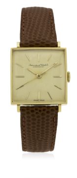 A GENTLEMAN'S 18K SOLID GOLD IWC SCHAFFHAUSEN WRIST WATCH CIRCA 1960s, REF. 1313  D: Champagne dial with gilt batons & hands. M: Manual wind movement signed International Watch Co. & numbered, calibre 401. C: Square shaped case, signed International Watch Co., hallmarked & numbered, case width measures approx. 27mm. S: Brown leather strap.CONDITION REPORT D: Dial in excellent condition, showing some very small signs of age. M: Working at present. C: In excellent condition. S: New. D: Dial / M: Movement / C: Case / S: Strap / B: Bracelet