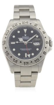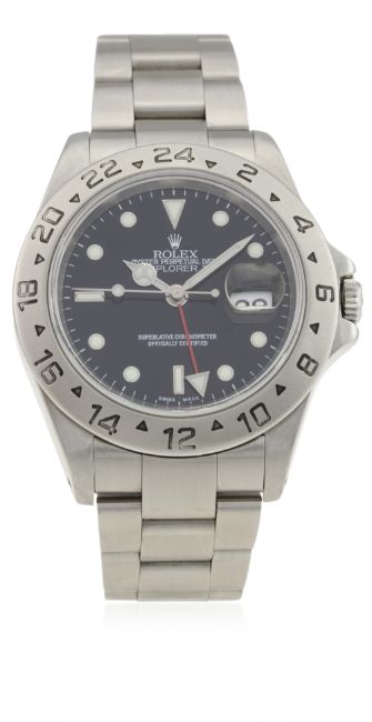 A GENTLEMAN’S STAINLESS STEEL ROLEX OYSTER PERPETUAL DATE EXPLORER II BRACELET WATCH CIRCA 2002, REF. 16570 D: Black dial with luminous inlaid white gold markers & Mercedes hands, dual time zone arrow hand, date aperture. M: 31 jewel automatic chronometer movement signed Montres Rolex S.A & numbered, calibre 3185. C: Oyster case with fixed 24 hour bezel, signed Montres Rolex S.A., Y serial no., Rolex crown, sapphire crystal, case diameter measures approx. 40mm. B: Rolex Oyster bracelet with flip lock clasp, numbered DT11/78790A.CONDITION REPORT D: Original dial in excellent condition. M: Working at present. C: In excellent condition, with some light scratches & wear due to general use. B: In very good condition, with some light scratches due to general use. D: Dial / M: Movement / C: Case / S: Strap / B: Bracelet
