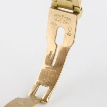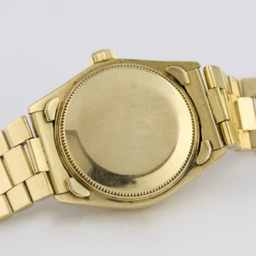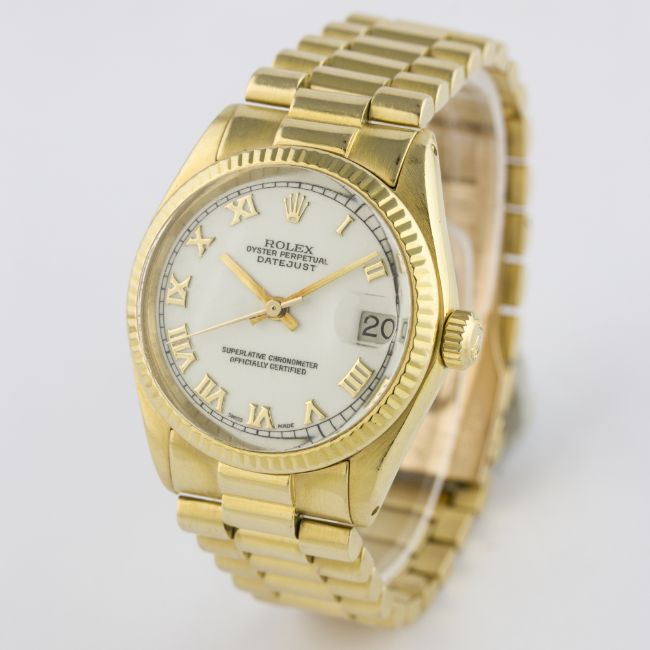 A MID SIZE 18K SOLID GOLD ROLEX OYSTER PERPETUAL DATEJUST BRACELET WATCH CIRCA 1977, REF. 68278 WITH ROLEX BOX & BOOKLET D: White dial with gold Roman numerals & hands, date aperture. M: Automatic chronometer movement, signed Rolex & numbered. C: Oyster case with fluted bezel, signed Montres Rolex S.A., 18k hallmarks, numbered, Rolex crown, case diameter measures approx. 31mm. B: Original 18k solid gold Rolex President bracelet.CONDITION REPORT D: Later Rolex dial in excellent condition. M: Working at present. C: In excellent condition, with some light scratches due to general use. B: In very good condition, with some light scratches due to general use. D: Dial / M: Movement / C: Case / S: Strap / B: Bracelet
