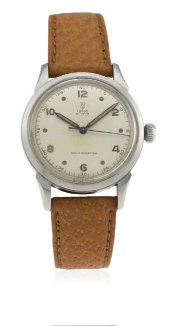 A GENTLEMAN'S STAINLESS STEEL ROLEX TUDOR OYSTER WRIST WATCH CIRCA 1940s, REF. 4540 D: Silver dial with luminous bi-hourly Arabic numerals & dot markers, luminous "pencil" hands. M: 17 jewel manual wind movement signed Tudor. C: Oyster case with "horn" lugs, signed Montres Tudor S.A., numbered, Oyster Patent crown, case diameter measures approx. 34mm. S: Leather strap.CONDITION REPORT D: Original dial in excellent condition with a light even patina. M: Working at present. C: In excellent condition, with some light scratches due to general use. S: In excellent condition. D: Dial / M: Movement / C: Case / S: Strap / B: Bracelet