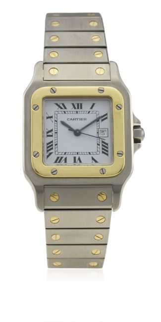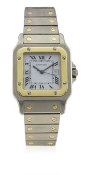 A GENTLEMAN'S STEEL & GOLD CARTIER SANTOS AUTOMATIC BRACELET WATCH CIRCA 1990s D: White dial with black Roman numerals & inner minute track, secret signature at VII, date aperture. M: Automatic movement signed Cartier. C: Square Santos case with solid gold bezel, signed santos de Cartier Automatique & numbered, original sapphire crown, case width measures approx. 29mm. B: Original Cartier steel & solid gold bracelet.CONDITION REPORT D: Original dial in excellent condition. M: Working at present. C: In excellent condition. B: In excellent condition. D: Dial / M: Movement / C: Case / S: Strap / B: Bracelet
