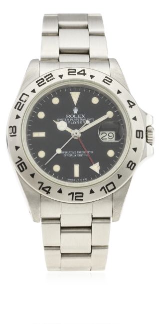 A RARE GENTLEMAN'S STAINLESS STEEL ROLEX OYSTER PERPETUAL DATE EXPLORER II BRACELET WATCH CIRCA 1985, REF. 16550 WITH "SPIDER" DIAL D: Black "rail" dial with luminous inlaid white gold markers, Mercedes hands, dual time zone arrow hand, date aperture. M: 27 jewel automatic chronometer movement, signed Rolex & numbered, calibre 3085. C: Oyster case with 24 hour bezel, signed Montres Rolex S.A., numbered, Rolex crown, case diameter measures approx. 40mm. B: Rolex Oyster bracelet, numbered 18/78360/501.CONDITION REPORT D: Original dial in excellent "spider web" condition. M: Working at present. C: In excellent condition with some small scratches due to general use. B: In excellent condition with some light scratches. D: Dial / M: Movement / C: Case / S: Strap / B: Bracelet