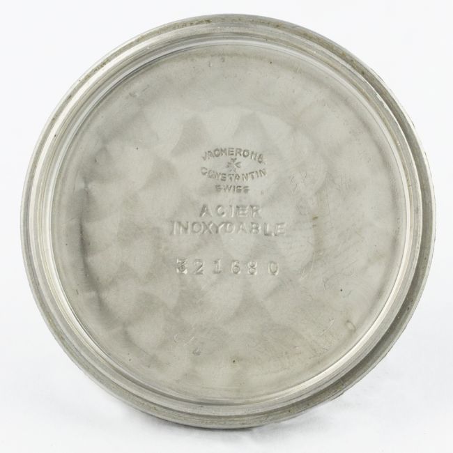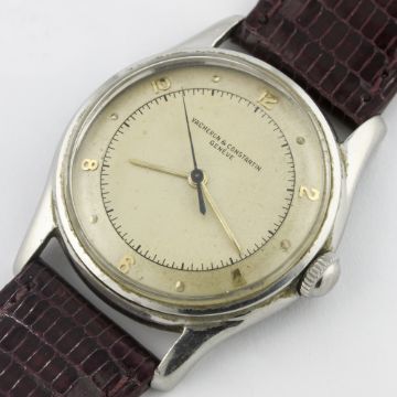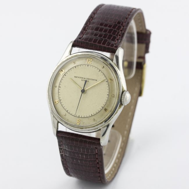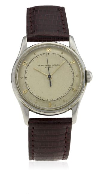 A RARE GENTLEMAN'S STAINLESS STEEL VACHERON & CONSTANTIN WRIST WATCH CIRCA 1950s D: Two tone silver dial with bi-hourly gilt Arabic numerals & dot markers, inner minute track. M: 17 jewel manual wind movement signed Vacheron & Constantin, numbered, calibre 466/3B. C: Circular screw back case, signed Vacheron & Constantin, case diameter measures approx. 32mm. S: Brown leather strap.CONDITION REPORT D: Original dial in excellent condition with an even patina. M: Working at present. C: In excellent condition with some light surface scratches. S: New. D: Dial / M: Movement / C: Case / S: Strap / B: Bracelet