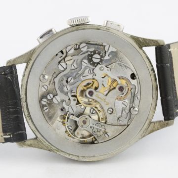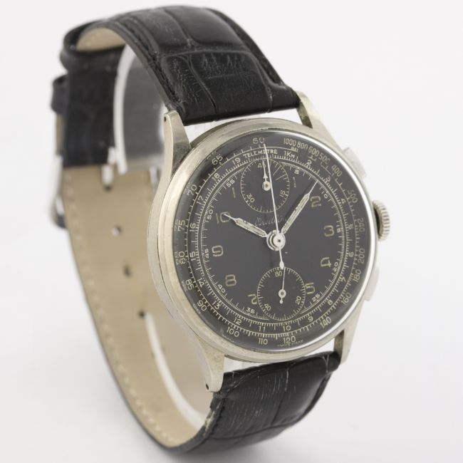 A GENTLEMAN'S BREITLING "UP & DOWN" CHRONOGRAPH WRIST WATCH CIRCA 1940s, REF. 179  D: Black dial with Arabic numerals, gilt font & tracking, double register recording minutes & continuous seconds, outer tachymetre & telemetre scales, "syringe" hands. M: 17 jewel manual movement signed Breitling. C: Circular chrome plated case with stainless steel back, numbered, case diameter measures approx. 37mm. S: Black leather strap.CONDITION REPORT D: Original dial in excellent condition, showing some small signs of age. M: Working at present. C: In excellent condition. S: In very good condition. D: Dial / M: Movement / C: Case / S: Strap / B: Bracelet