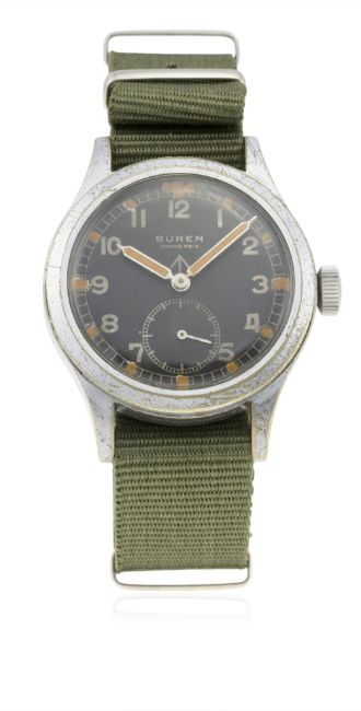 A GENTLEMAN'S STAINLESS STEEL BRITISH MILITARY BUREN GRAND PRIX W.W.W. WRIST WATCH CIRCA 1940s WITH "L" CASE D: Black dial with Arabic numerals, luminous markers & hands, military arrow, subsidiary seconds. M: 15 jewel manual wind movement, signed Buren Grand Prix. C: Military nickel plated case with fixed bars, stainless steel back, issue markings W.W.W. ^ L21853 539700, dust cover, case diameter measures approx. 36mm. S: NATO strap.CONDITION REPORT D: Original dial in very good condition, showing some small signs of age. M: Working at present. C: In good condition, with some small scratches & wear to the nickel plated top due to use. S: In excellent condition. D: Dial / M: Movement / C: Case / S: Strap / B: Bracelet