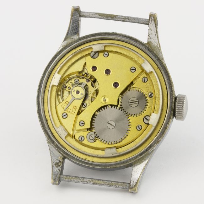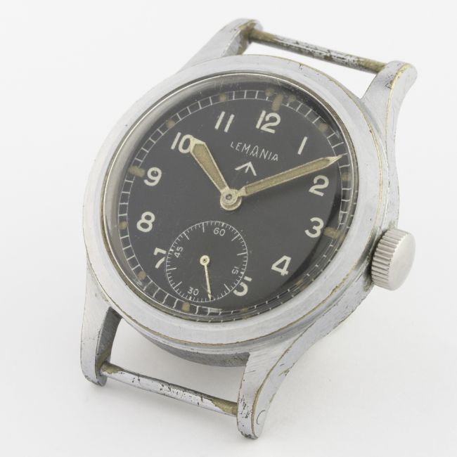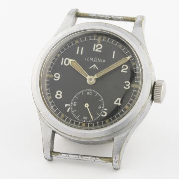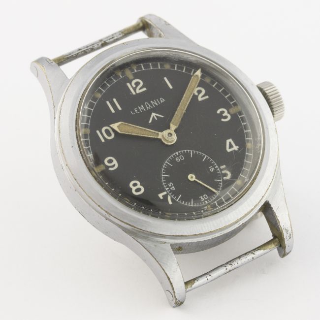 A GENTLEMAN'S BRITISH MILITARY LEMANIA W.W.W. WRIST WATCH CIRCA 1940s WITH "L" CASE D: Black dial with Arabic numerals, luminous markers & "sword" hands, military subsidiary seconds. M: Manual wind movement, calibre 27A. C: Chrome plated & stainless steel military case with fixed bars, issue markings W.W.W. ^ L28010 545857, lug marked 022, case diameter measures approx. 36mm. S: NATO strap. CONDITION REPORT D: Original dial in excellent condition. M: Working at present. C: In very good condition, with some small scratches & signs of wear due to use. S: New. D: Dial / M: Movement / C: Case / S: Strap / B: Bracelet