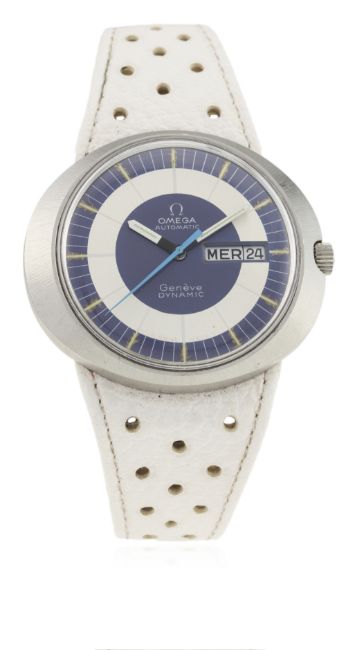 A GENTLEMAN'S STAINLESS STEEL OMEGA GENEVE DYNAMIC AUTOMATIC WRIST WATCH CIRCA 1970s, WITH ORIGINAL BOX D: Blue & silver dial with luminous markers, blue centre seconds hand, day & date aperture. M: Automatic movement, signed Omega & numbered. C: Oval shaped case, signed Omega Watch Co., Omega crown, case width measures approx. 41mm. S: Original Omega perforated white leather strap & pin buckle.CONDITION REPORT D: Original dial in very good condition. M: Working at present. C: In excellent condition, with some light scratches due to general use. S: In excellent condition. D: Dial / M: Movement / C: Case / S: Strap / B: Bracelet