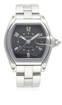 A GENTLEMAN'S STAINLESS STEEL CARTIER ROADSTER AUTOMATIC BRACELET WATCH CIRCA 2006, REF. 2510 WITH LAS VEGAS ROULETTE DIAL D: Black dial with concentric rings, bi-hourly luminous Arabic numerals & red minute/seconds markers, date aperture. M: Automatic movement signed Cartier. C: Tonneau shaped case, signed Cartier Roadster & numbered, original crown, case width measures approx. 38mm. B: Original Cartier Roaster stainless steel bracelet.CONDITION REPORT D: Original dial in excellent condition. M: Working at present. C: In excellent condition, with some light scratches. B: In excellent condition, with light scratches due to general use. D: Dial / M: Movement / C: Case / S: Strap / B: Bracelet